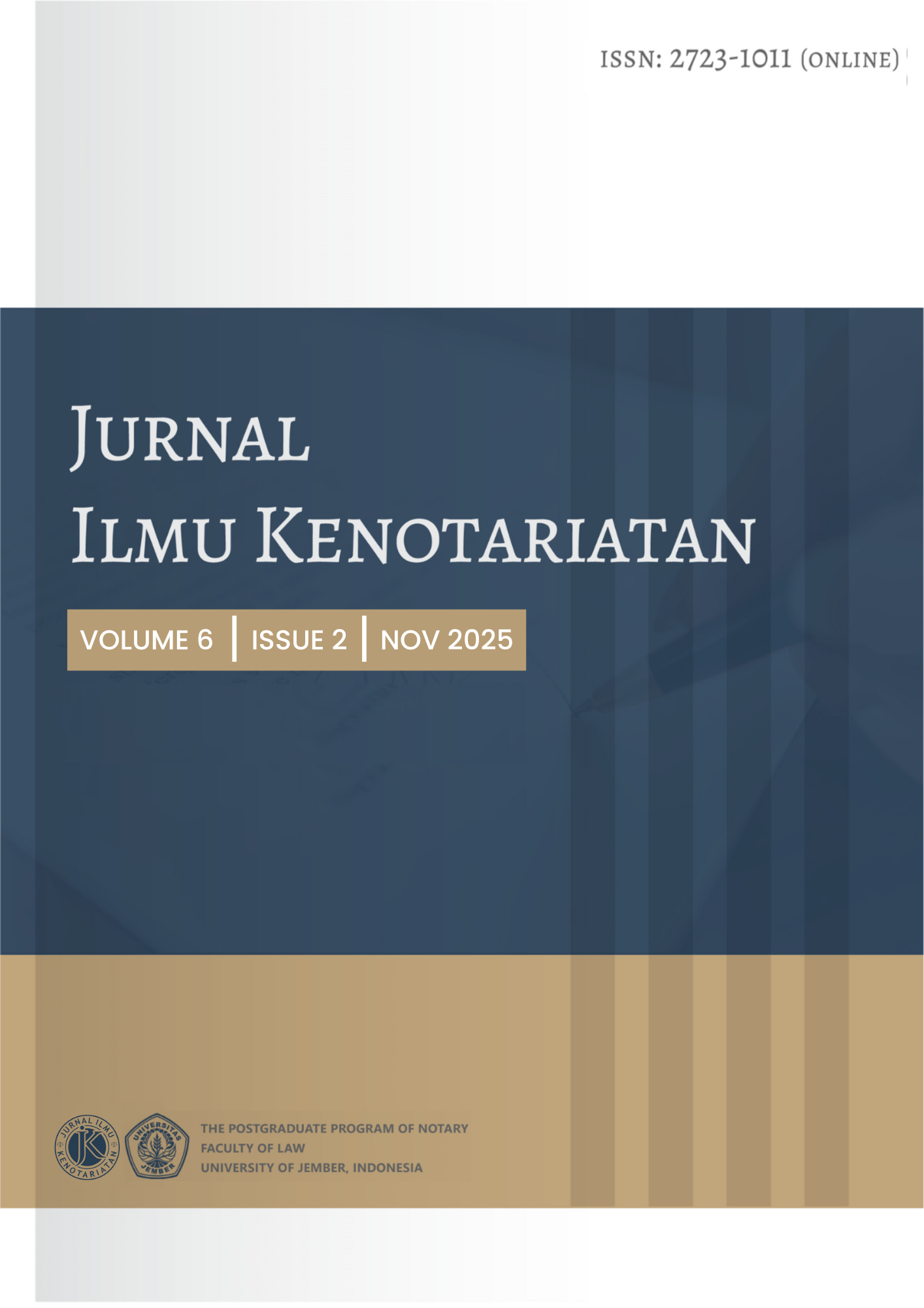 Vol. 6 No. 2Jurnal Ilmu Kenotariatan (JIK) is an open-access peer-reviewed scholarly journal which publishes original articles on the most recent knowledge, researches, or applied researches and other development in fields of Notary Law.